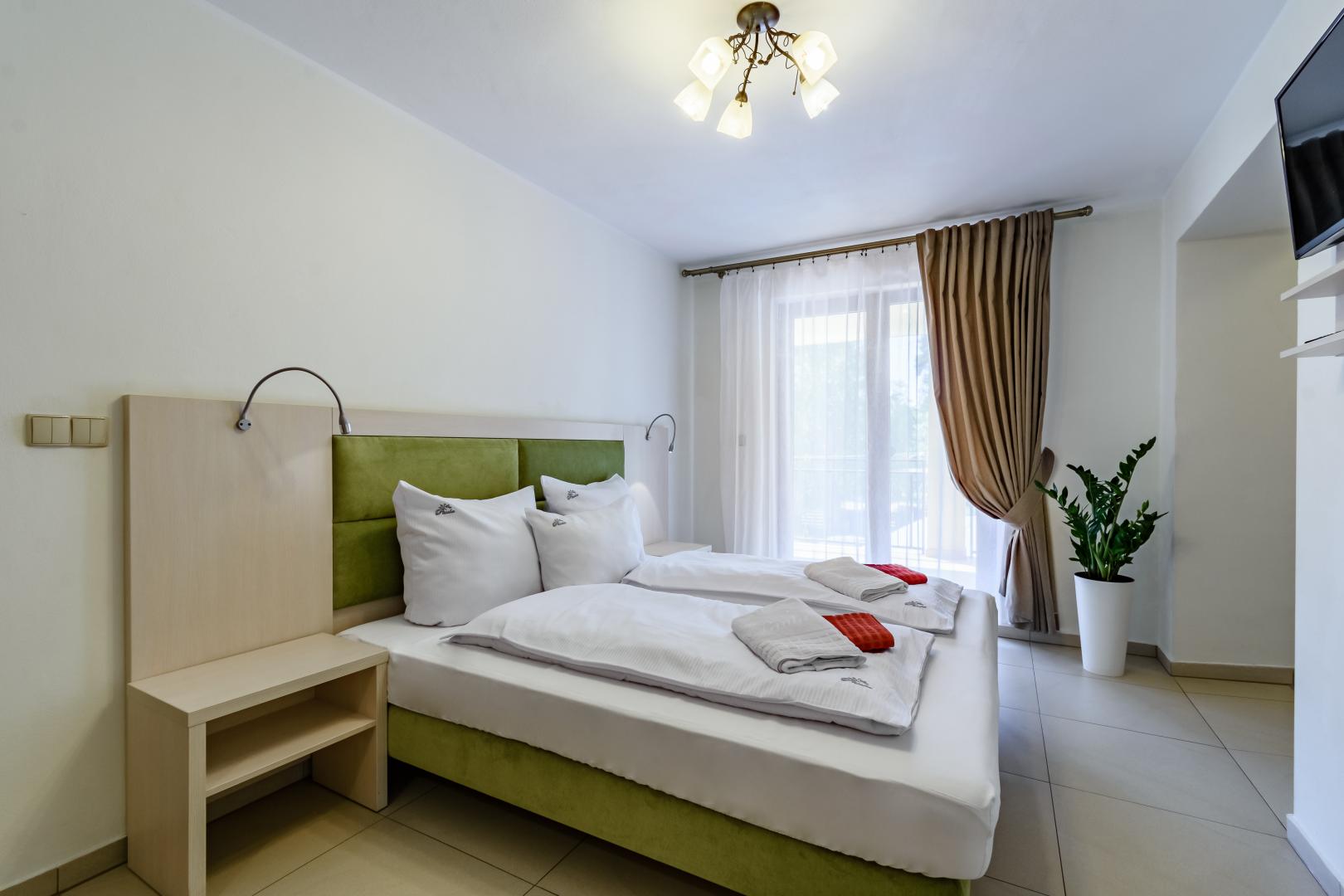 Zakwaterowanie: przytulnie urządzone pokoje 1, 2, 3 osobowe, wszystkie z łazienkami, TV, mini lodówką. Komfortowe, 4 osobowe domki oraz bungalowy z aneksami kuchennymi - na zapytanie.